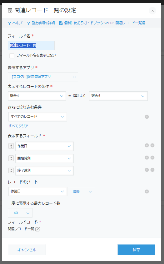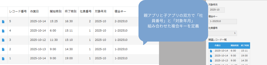 関連レコードフィールドは、親アプリの「複合キー」と子アプリの「複合キー」を指定します。