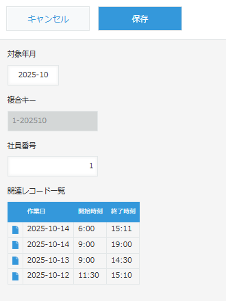 月次レポートアプリに社員番号1、対象月2025-10として入れ保存すると、紐づいた登録情報が出てきます。社員番号2として、別の社員の情報を登録するなどできます。