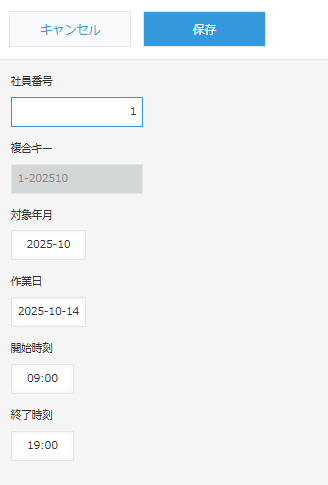 日報アプリに社員番号1、対象月2025-10、日付、開始時刻、終了時刻を入れ集計対象のデータを作成します。