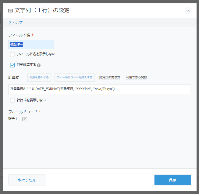 複合キーの定義として、自動計算の設定を有効にし計算式を入れます。