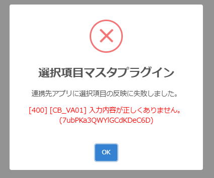 「選択項目反映」ボタンを押したときに、以下のようなポップアップとともに、「[CB_VA01] 入力内容が正しくありません。」と表示されます。